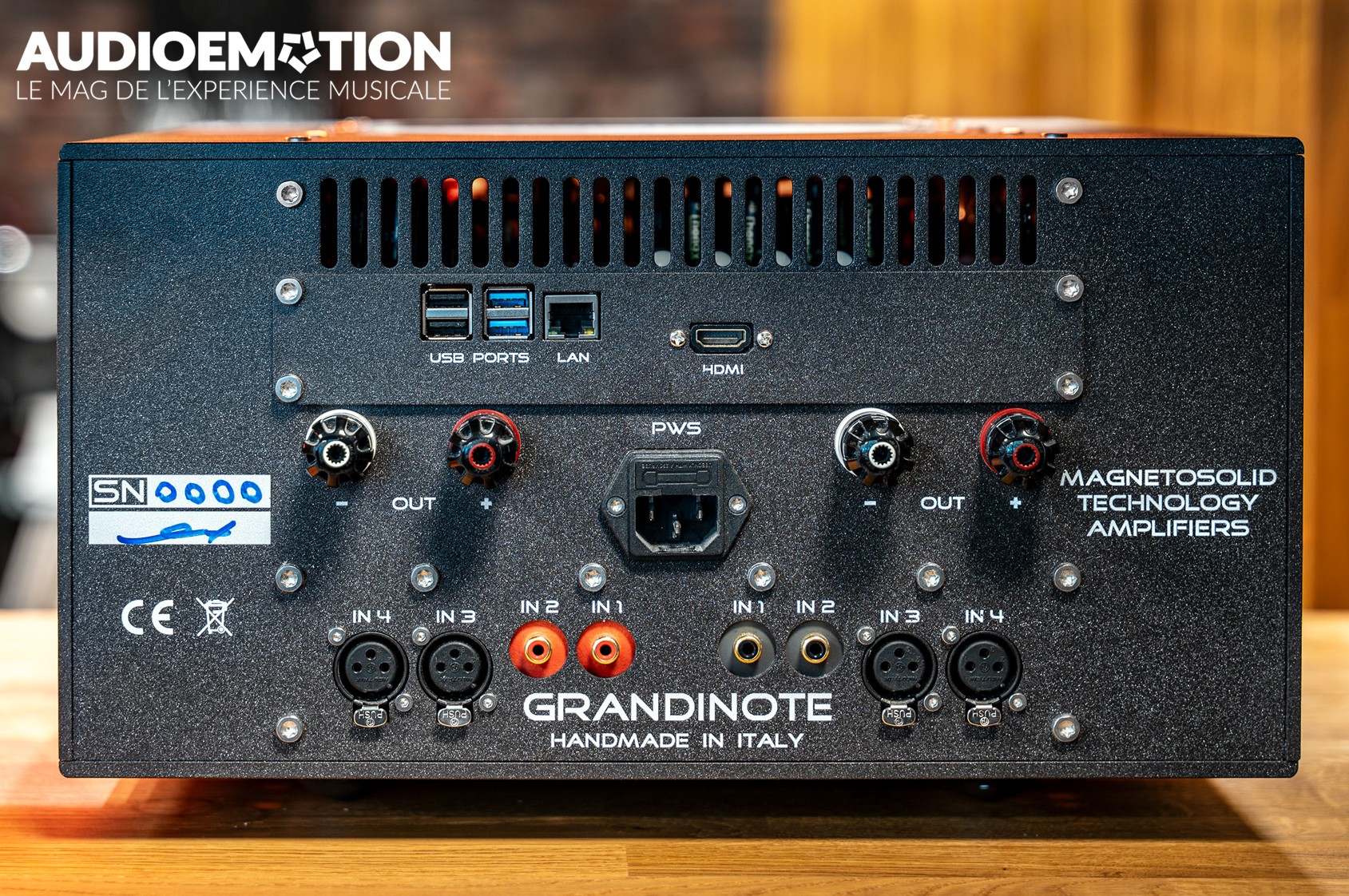 Le GRANDINOTE Solo est totalement symétrique : 2 entrées asymétriques (RCA), et 2 entrées symétriques (XLR), soit 4 entrées au total, lui permettant de piloter pratiquement n’importe quelle enceinte du marché.