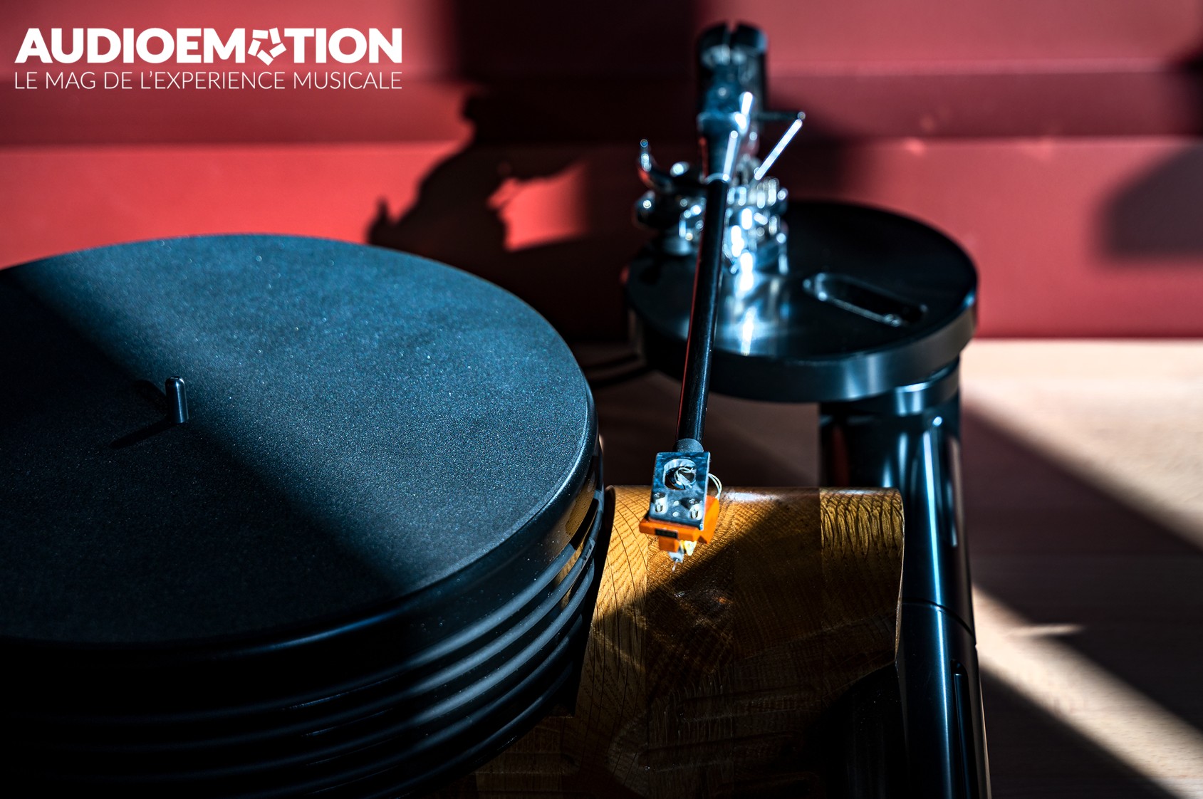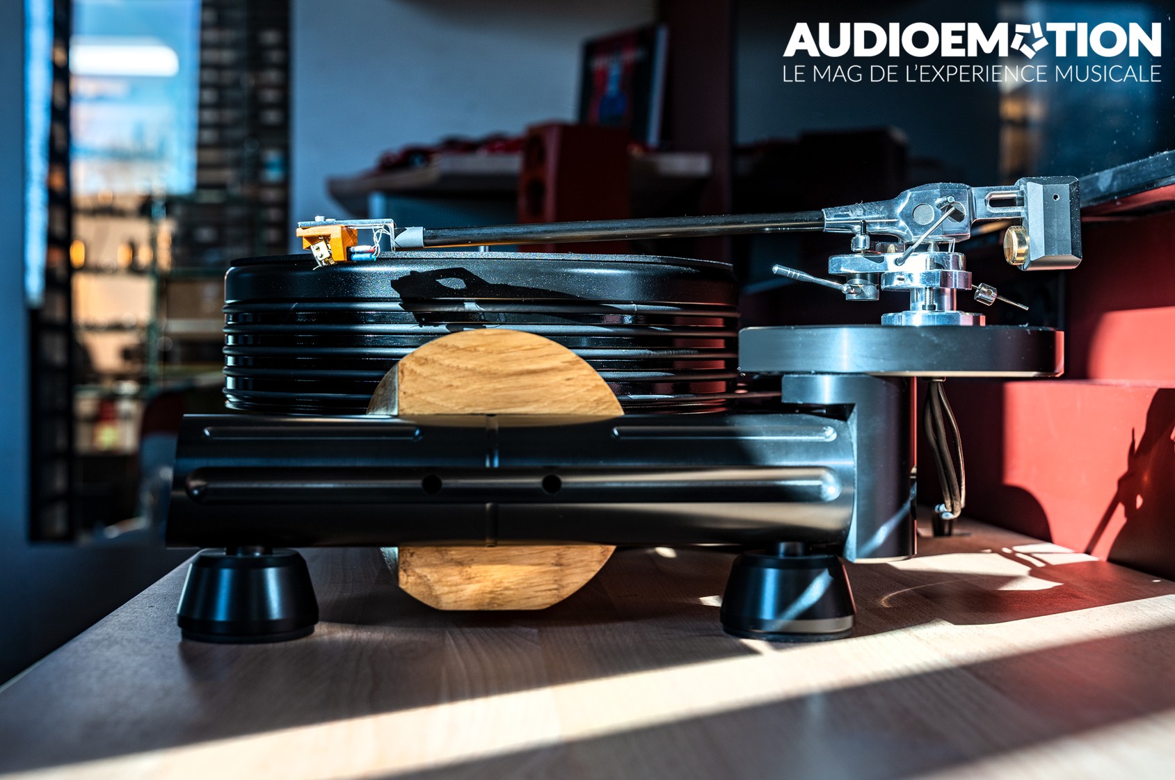 Elle repose sur un socle en bois massif, collé de manière spéciale pour éviter la transmission des vibrations autant que possible. Ce socle est monté sur des tiges métalliques, elles-mêmes fixées sur des pieds en Delrin, avec une base découplée. En somme, tout est pensé pour isoler mécaniquement la platine des vibrations et résonances, afin de rendre l’écoute la plus silencieuse et fidèle possible !