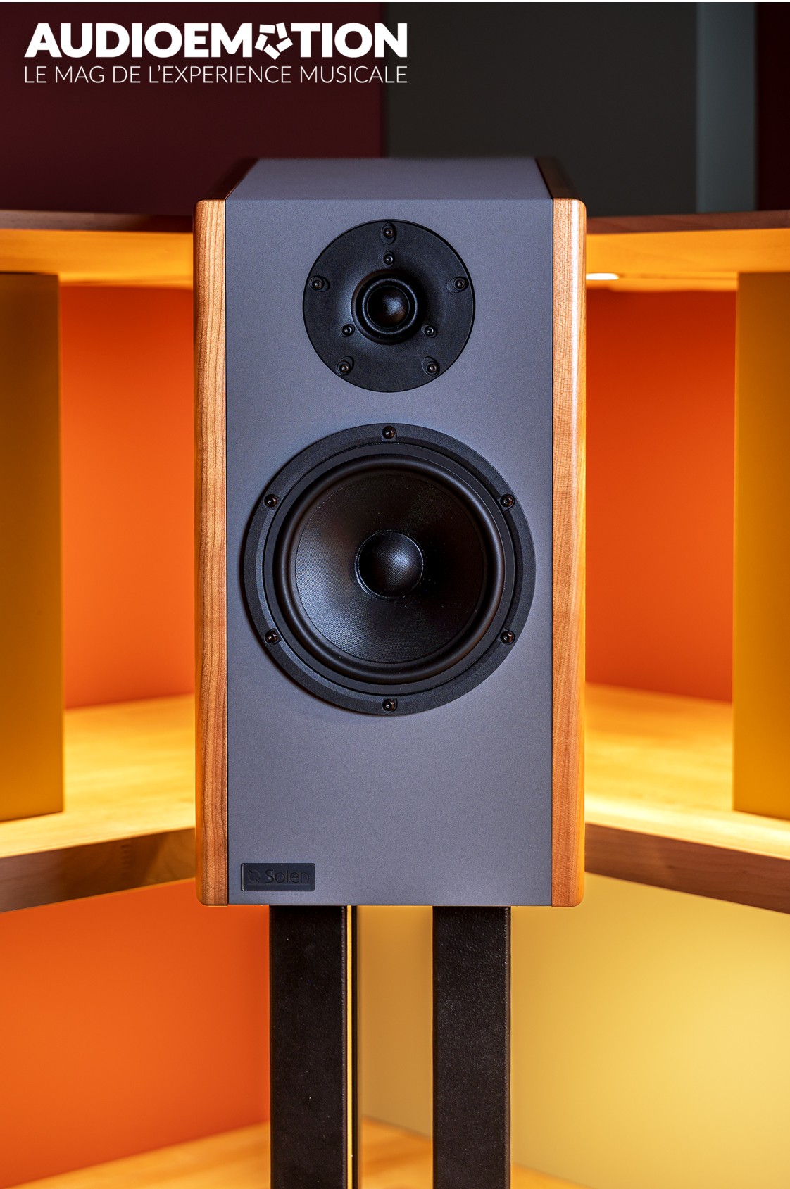 Ces petites enceintes, relativement légères (12kg), concilie tradition et modernité. En effet, le bois de mérisier, caractéristique des parois latérales, s’accorde parfaitement avec les meubles en bois, anciens ou récents, tandis que le centre couleur grise et la forme trapézoïdale apporte une touche de modernité à tous les espaces, autre que fonctionnelle à la réduction des ondes stationnaires.
