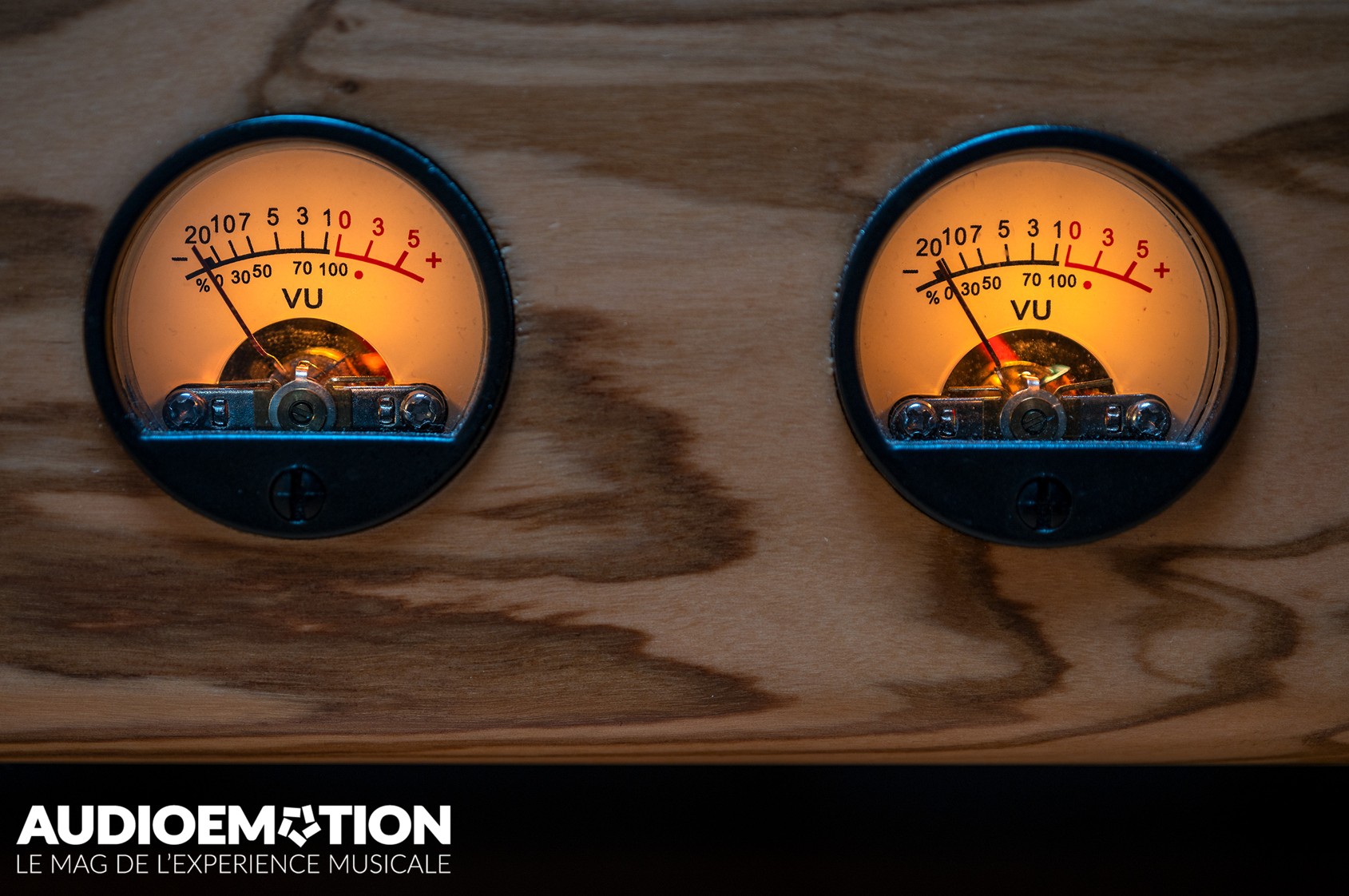 Esthétiquement, le design est assez intéressant : rétro et moderne à la fois. Il est beau, avec des matériaux de première qualité, comme du bois massif d’olivier pour le boîtier, et un revêtement assez épais sur la surface supérieure. Les transformateurs sont visibles, ce qui ajoute un côté esthétique au produit. Petit détail sympa : le sélecteur d’entrée, également à tube, est signalé par une petite lumière qui indique l’entrée active. C’est un petit plus, mais qui montre bien le soin apporté à chaque détail.